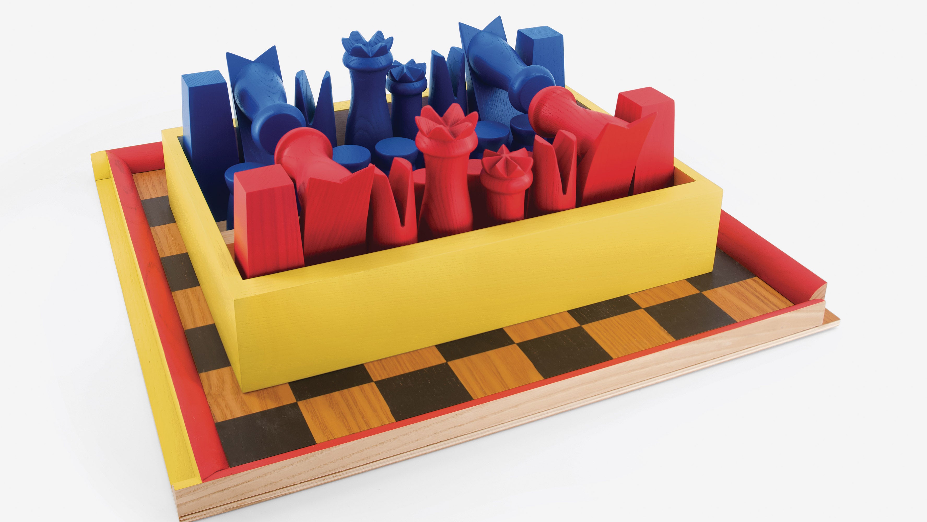 Medium: Painted wood chess set comprised of 32 pieces, board, and yellow tray, additionally accompanied by two archival pigment prints after drawings from Calder's Chess Knightmare series, all contained in a cardboard presentation box