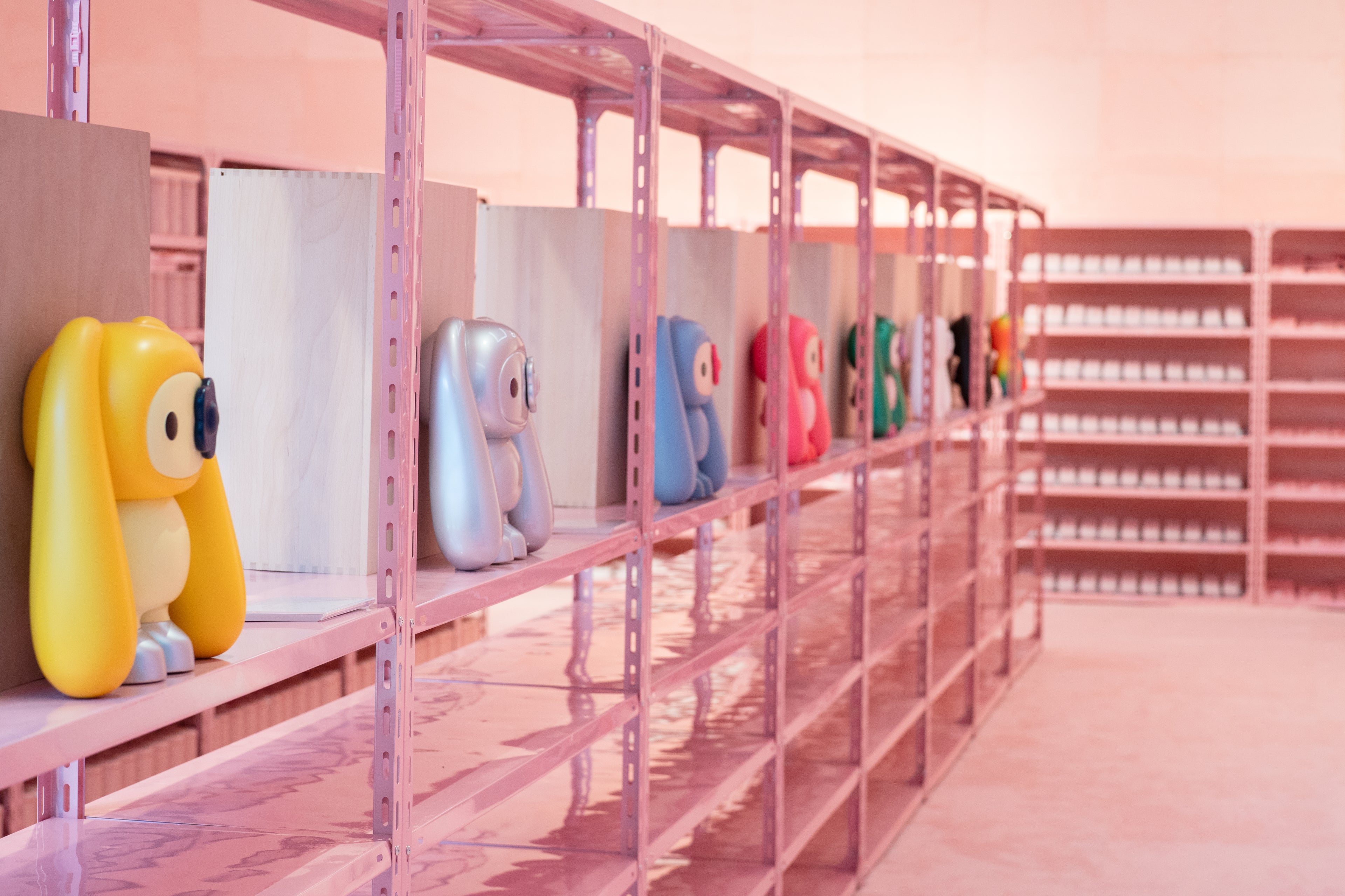 The exhibition space will be transformed with vibrant, supermarket-inspired pink shelving, plush foam flooring, and a large hyper realistic juju drawing that brings Hendry’s bold vision to life.