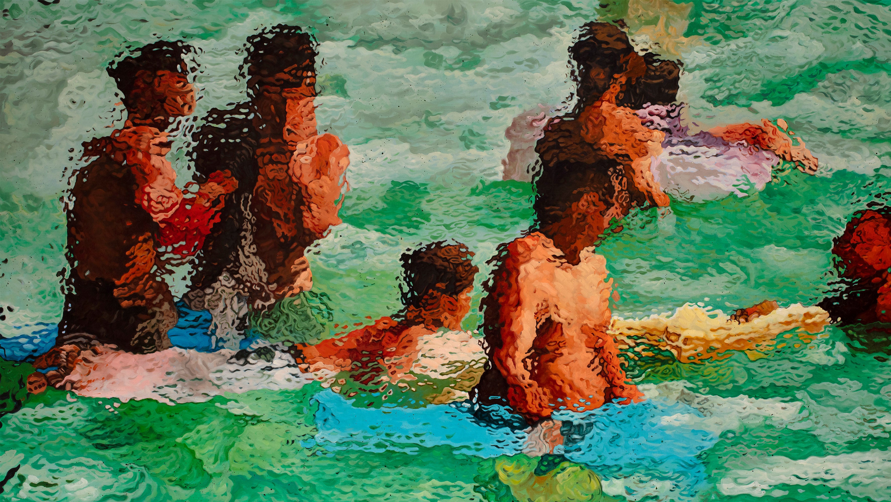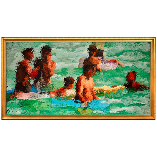 The visual and conceptual language of Olaísmo evolved over more than a decade, with the wave functioning as structure, metaphor, and method. Its surfaces are unstable—displaced, refracted, optically disturbed—offering not a direct image of the world but one filtered through water, where memory ripples and shifts. In Beachers, these works frame the beach not as picturesque scenery, but as a psychological and historical condition—an unstable threshold between departure and return.
