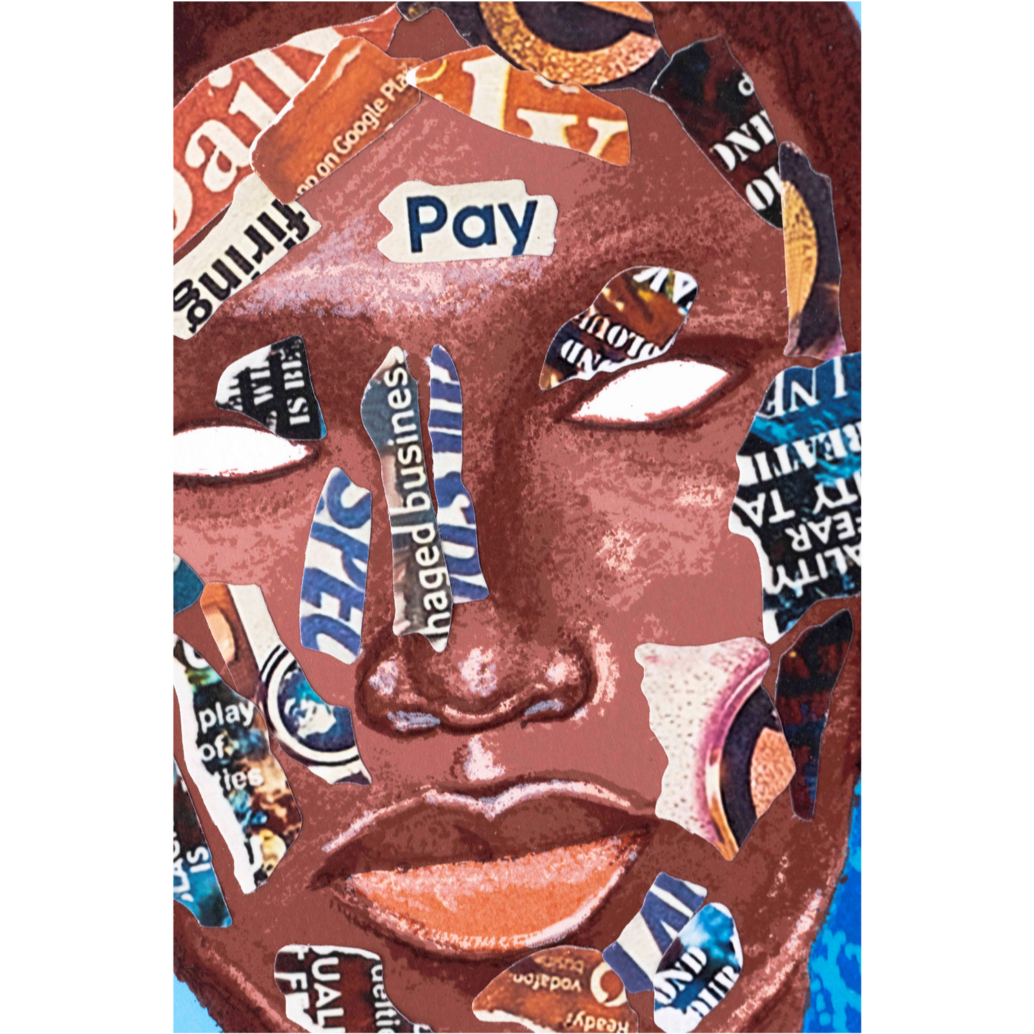 Emmanuel Taku, (b. 1986, Ghana) is a graduate in Visual Arts and Textiles from the Ghanatta Institute of Art and Design. Taku’s portraits capture Black subjects that radiate vitality, emphasizing the strength of a united community. Often inspired by fashion poses in magazines, Taku selects subjects of interest, highlighting the figurative elements by selecting colors that best capture the spirit of his subjects. Taku’s silk-screening technique reflects his love for Ghanian textiles: patterns which were often worn by his mother and sister. The artist cuts and pastes fragments of local newspapers to highlight the skin of his subjects, thereby including traces of the country’s history on the canvas. With this technique, Taku is hoping to document what is happening currently around him as he is creating, explaining that he hopes that ‘anyone who sees my paintings a hundred years to come will still be able to have an idea of what happened during Taku’s era’.