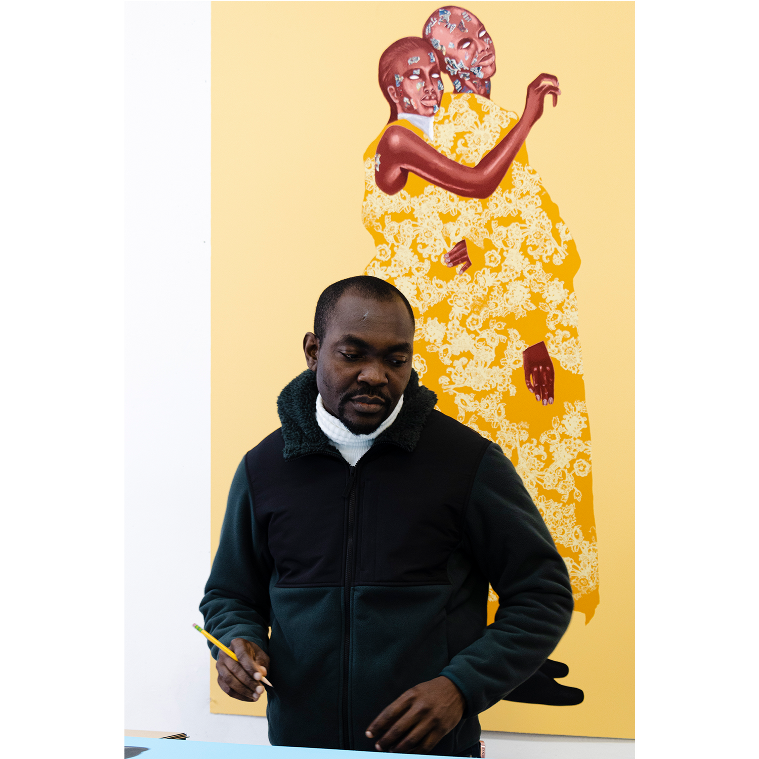 Two to Tango, marks Emmanuel Taku’s editions debut, graphically reinterpreting his distinct approach to portraiture through elaborately layered screenprints with intricate collage elements. The saturation color and density of ink achieved with more than 20 colors per print showcase the artist’s adept use of tone to create an image that sits at the intersection of depth and flatness, creating a visual tension that draws in the viewer.