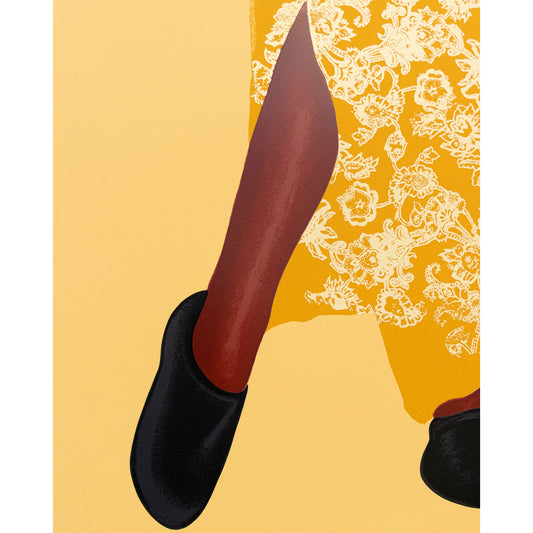 Textiles are at the center of Taku’s work, intimately referencing his family through the patterned fabrics of dresses sewn by his mother and paisley designs favored by his sister. Printed with glossy enamel, the delicate floral patterns are slightly raised above the paper’s surface as they dance across the subject’s clothes. The florals run uniformly across the image without adhering to the folds and dimensionality of the garments. The pronounced and abstracted motif adds texture to the print, evoking the artist’s mixed-media practice and channeling his ethos through the print medium.