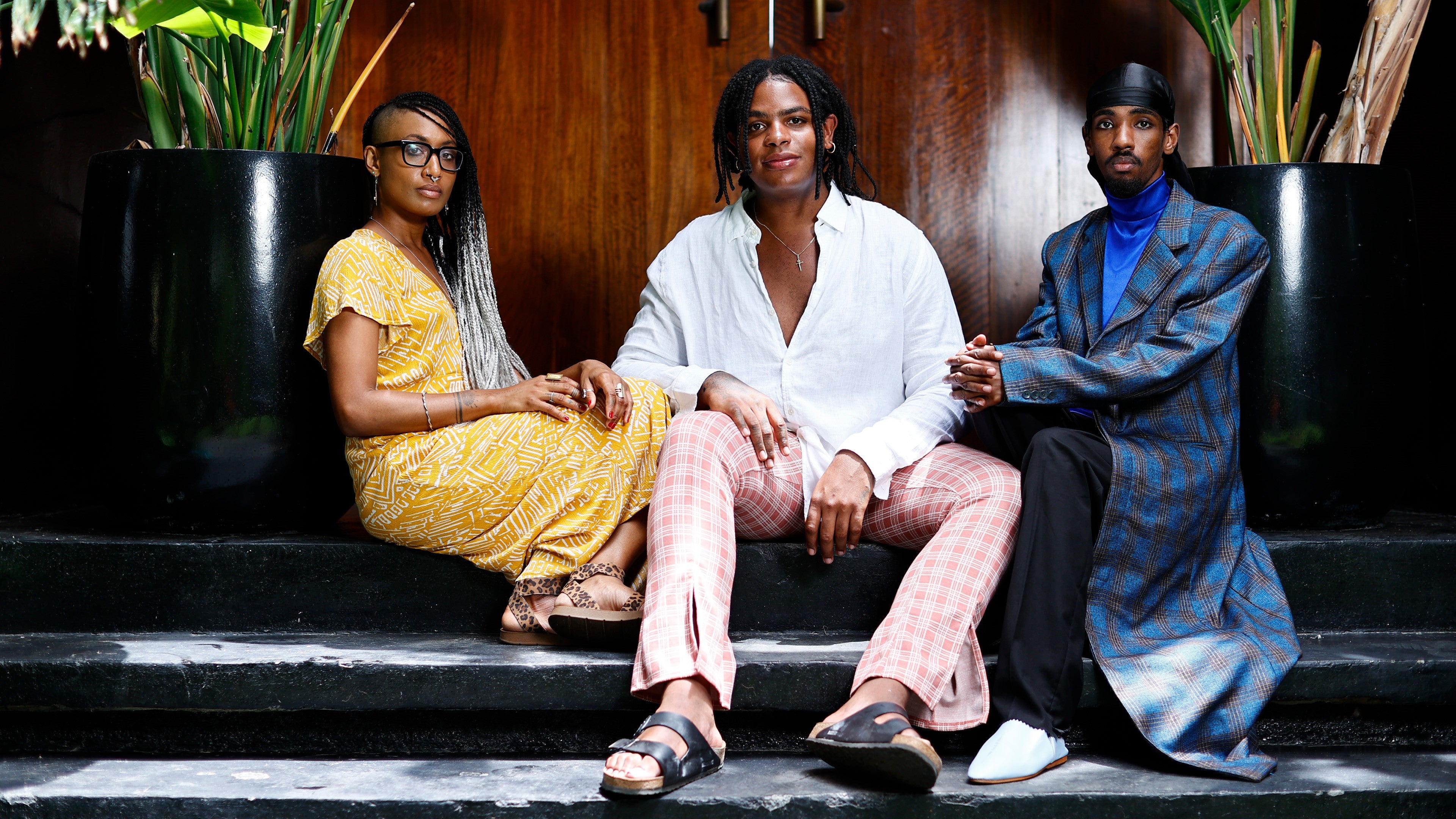 Artists-in-residence Sophia Nahli Allison, Gouled Ahmed and Khalif Tahir Thompson outside the doors of Black Rock Sénégal. © 2022 Kehinde Wiley and Black Rock Sénégal. Photographer: Badara Preira.