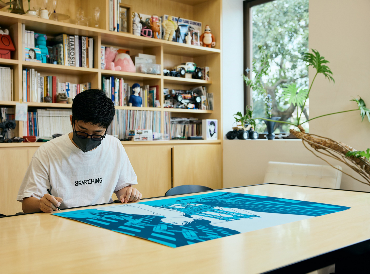 KYNE (b. 1988, Fukuoka) started his career as a graffiti artist before attending art school, ultimately evolving past his formal training to blaze a new path; where he now stands as one of Japan’s leading commercial artists. KYNE’s work features fearless women with striking gazes, creating iconic portraits that maintain an explicit boundary between the world of the figure’s and that of the viewers. KYNE achieves his style through precise, stylized linework and bold colors, giving his work a distinct, Japanese look that has captured global admiration of the younger, brand-aware generation.
