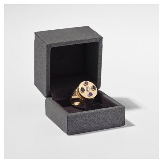 Medium: 14 karat gold ring set with a brilliant-cut diamond, circular-cut ruby, circular-cut amethyst, and two oval-cut onyx.