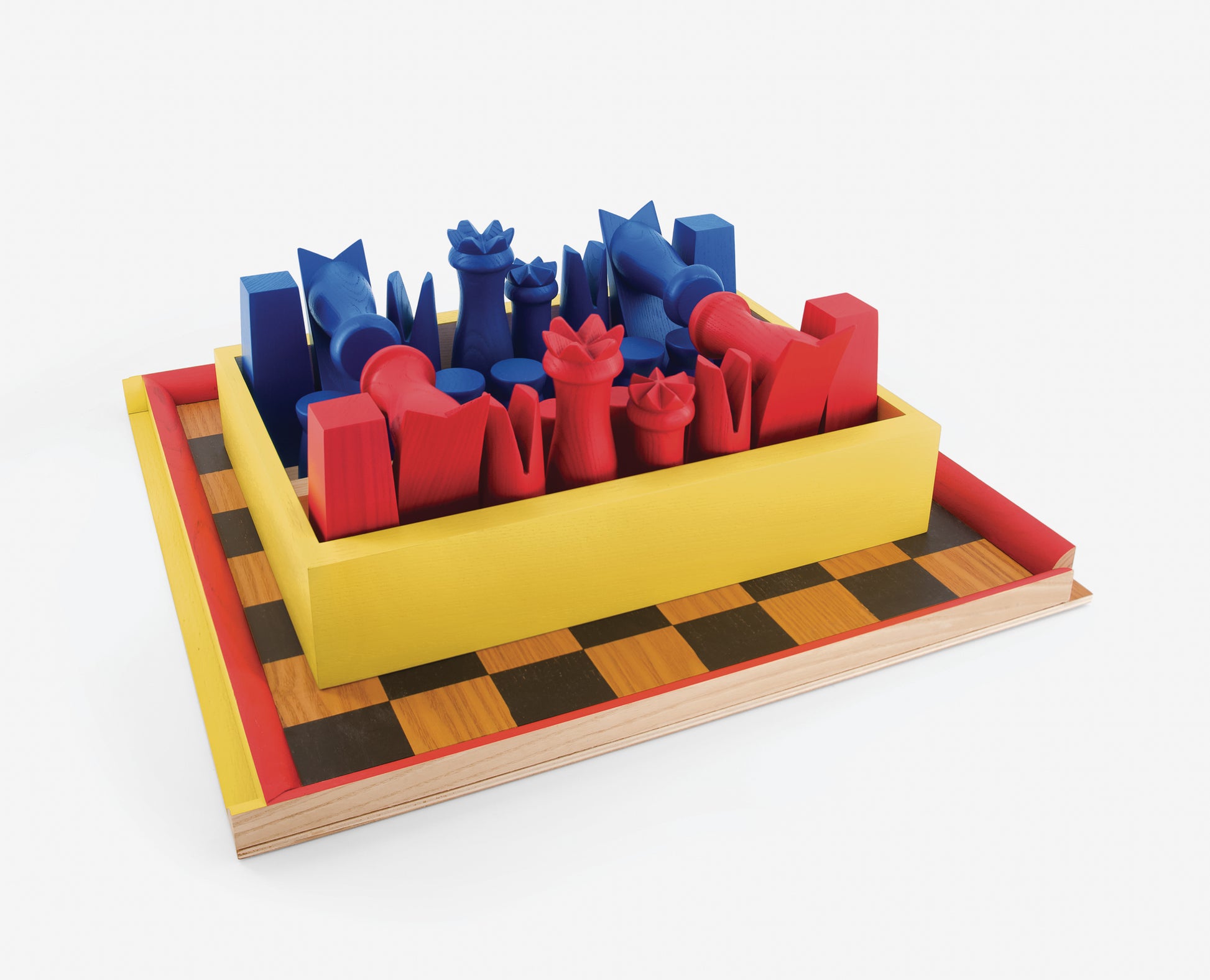 Medium: The complete painted wood chess set comprised of 32 pieces, board, and yellow tray, the pieces each within a custom drawstring dust bag, additionally accompanied by three archival pigment prints after drawings from Calder's Knightmare series, all contained in a cardboard presentation box.