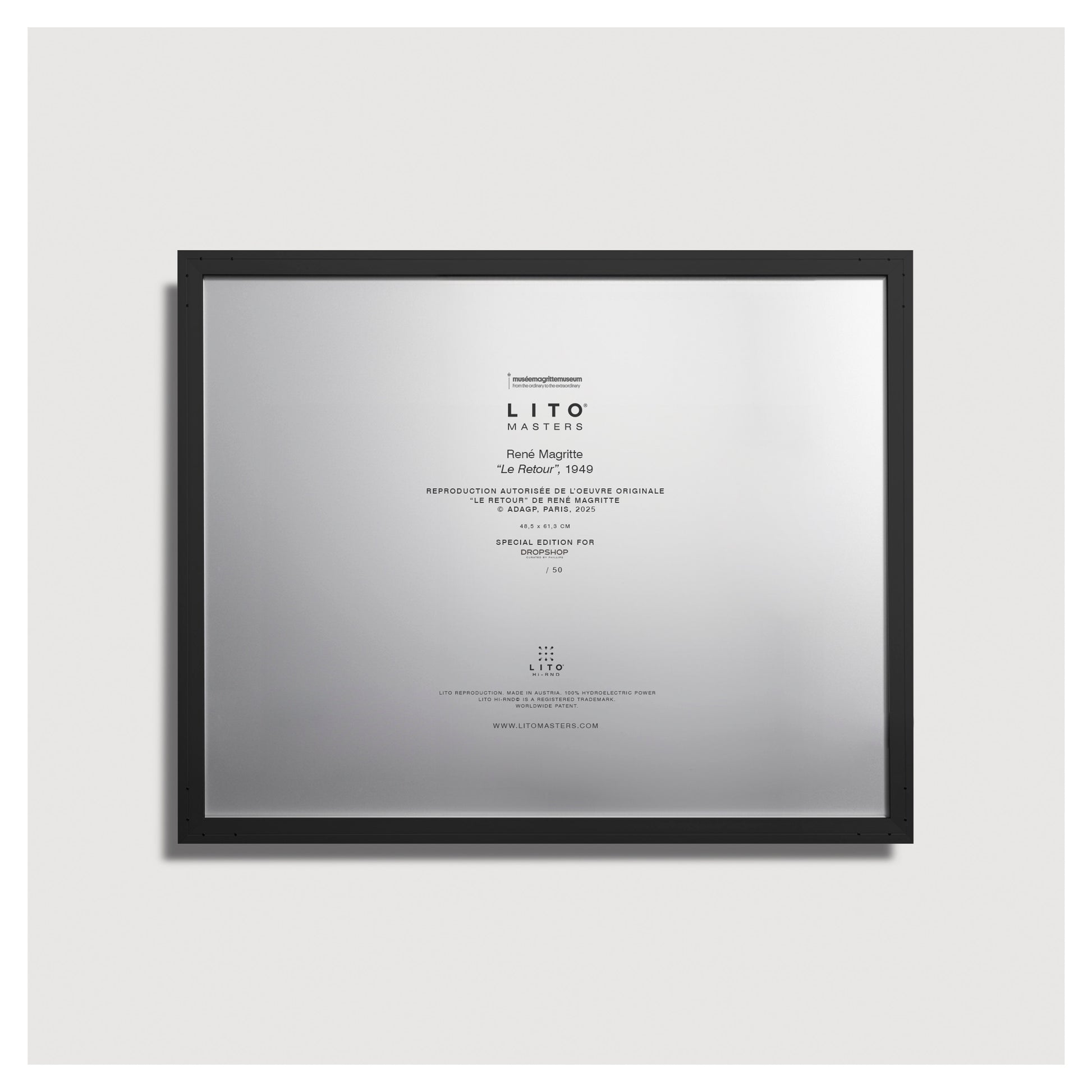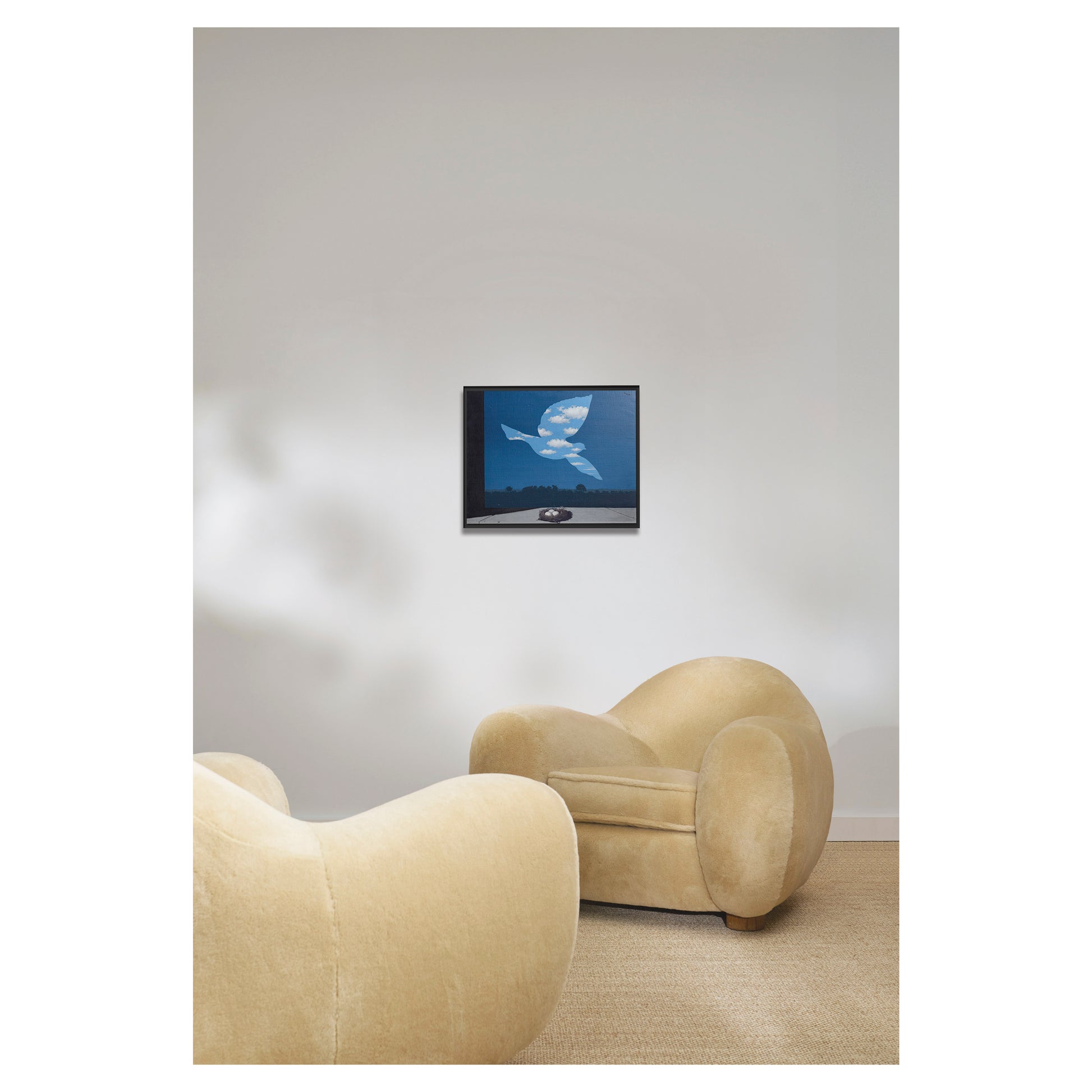 In Le retour, Magritte reimagines a bird in flight, its body composed not of feathers, but of sky, cloud, or sea, merging nature and illusion in a single poetic form. Le retour exemplifies Magritte's fascination with transformation and the unexpected unity of opposing elements. The motif echoes his broader exploration of perception and the unseen forces that shape our understanding of reality.