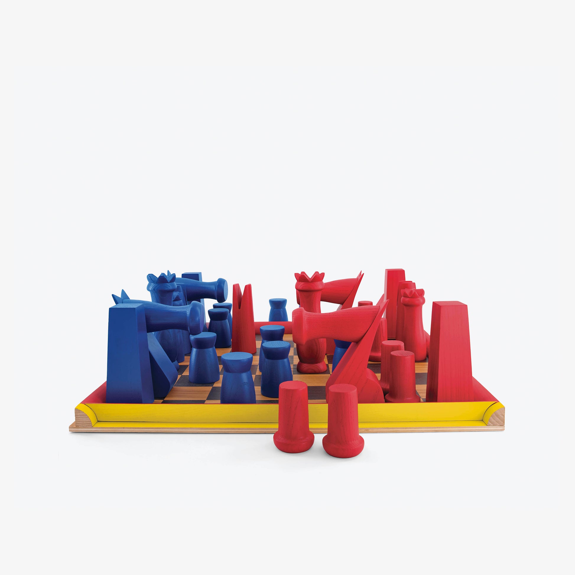 Medium: The complete painted wood chess set comprised of 32 pieces, board, and yellow tray, the pieces each within a custom drawstring dust bag, additionally accompanied by two archival pigment prints, all contained in a cardboard presentation box.