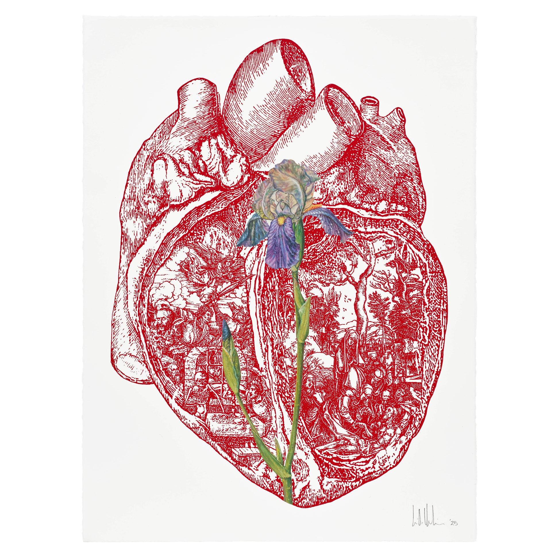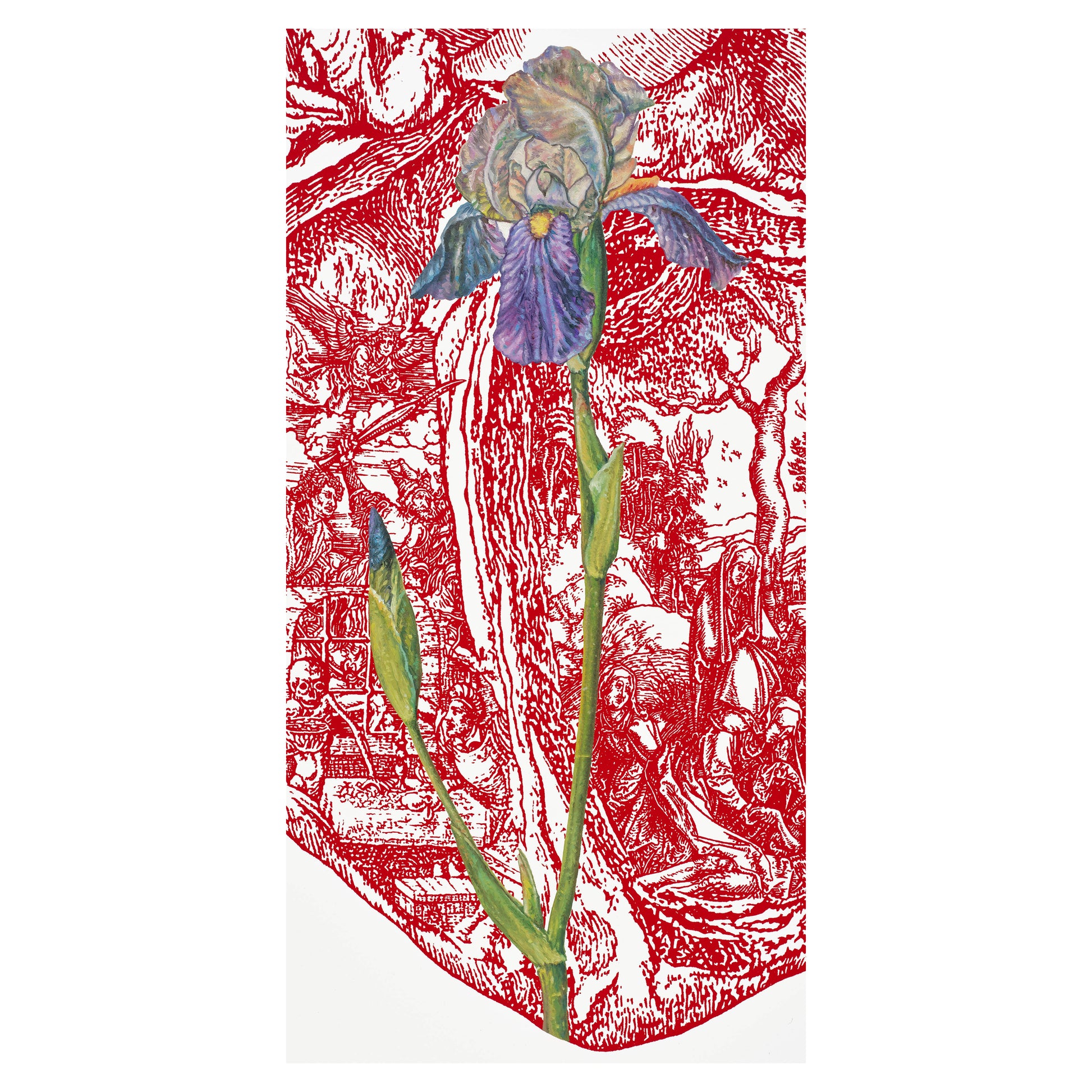 Medium: Screenprint in red with unique extensive hand-embellishment in oil, on coated Rives BFK 280 GSM