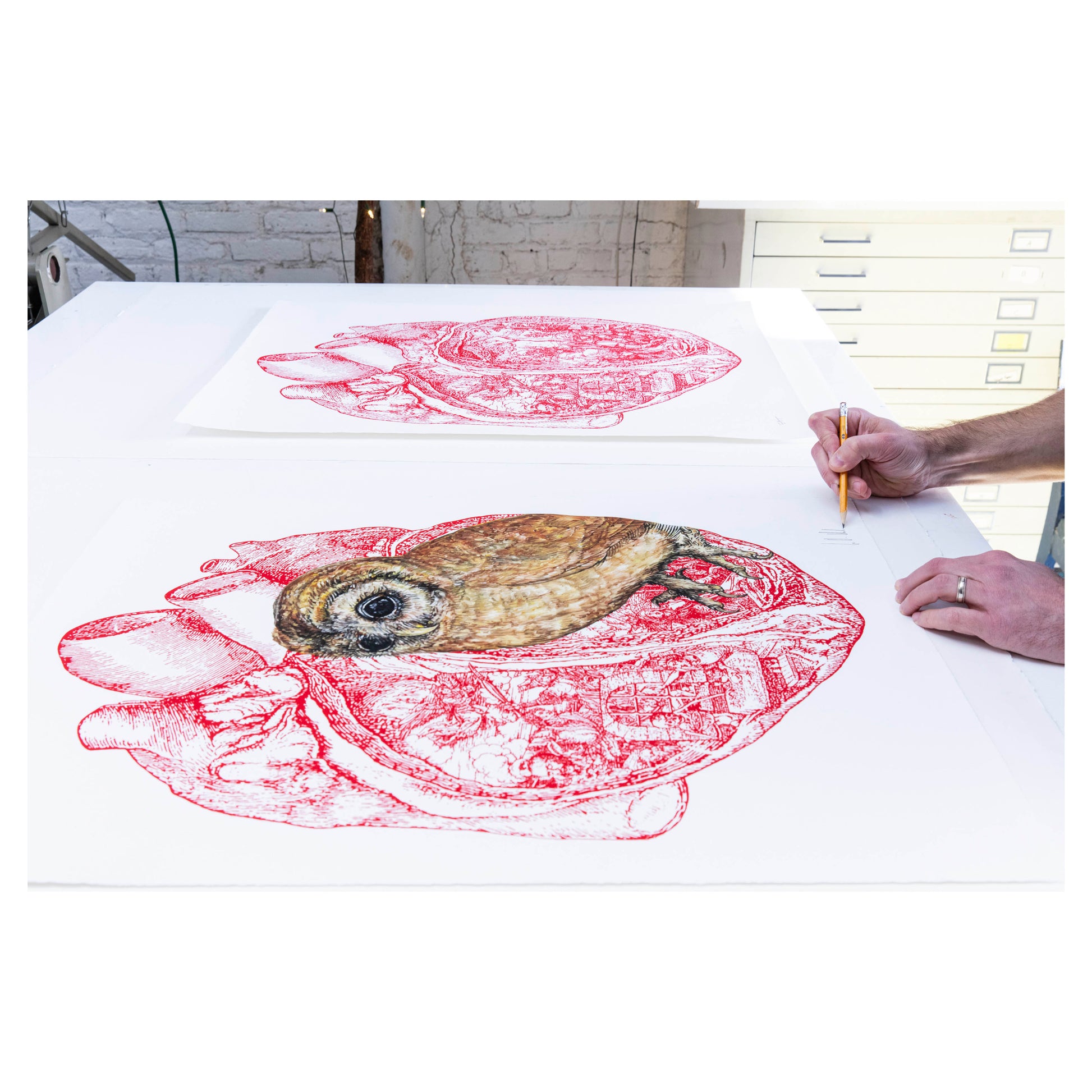 Medium: Screenprint in red with unique extensive hand-embellishment in oil, on coated Rives BFK 280 GSM