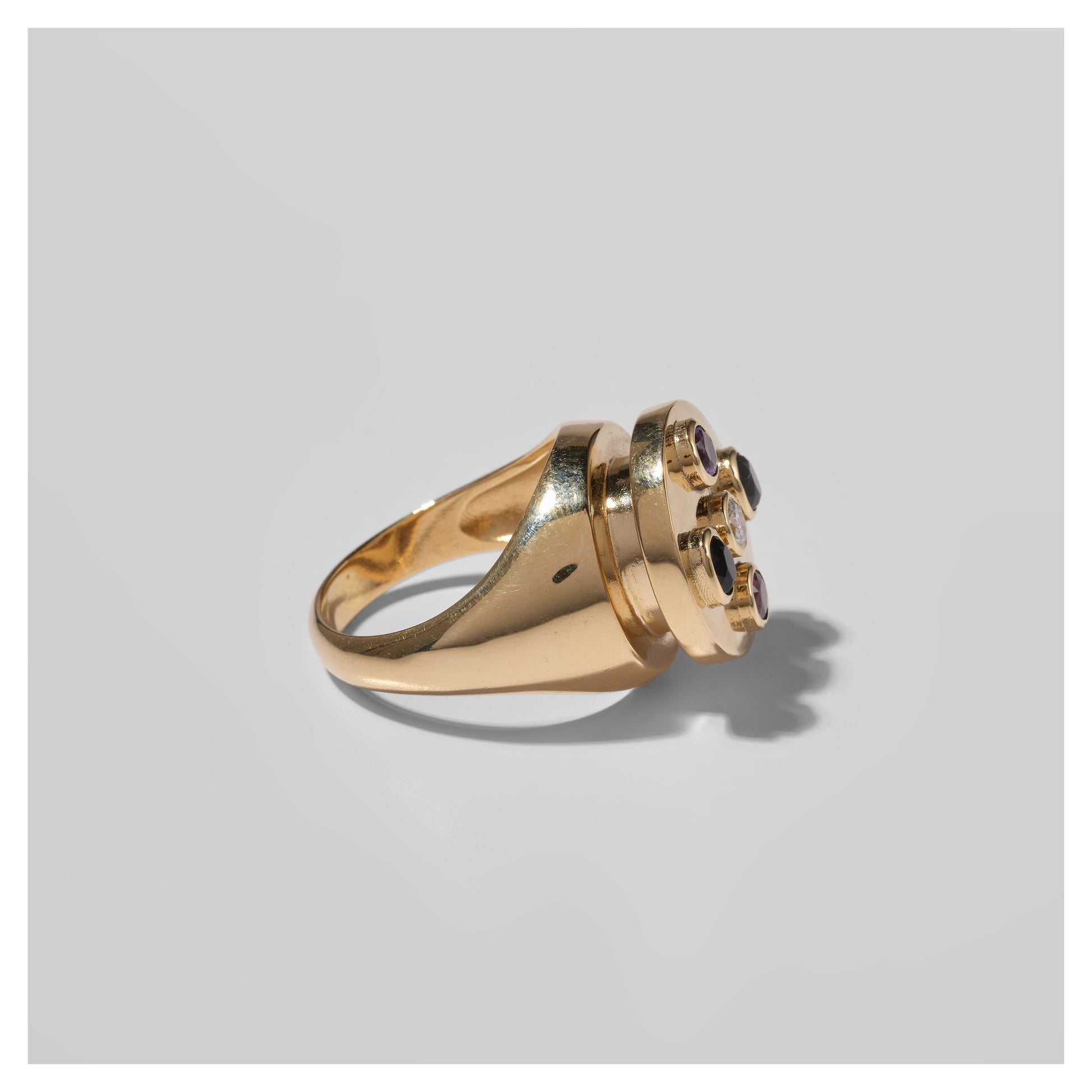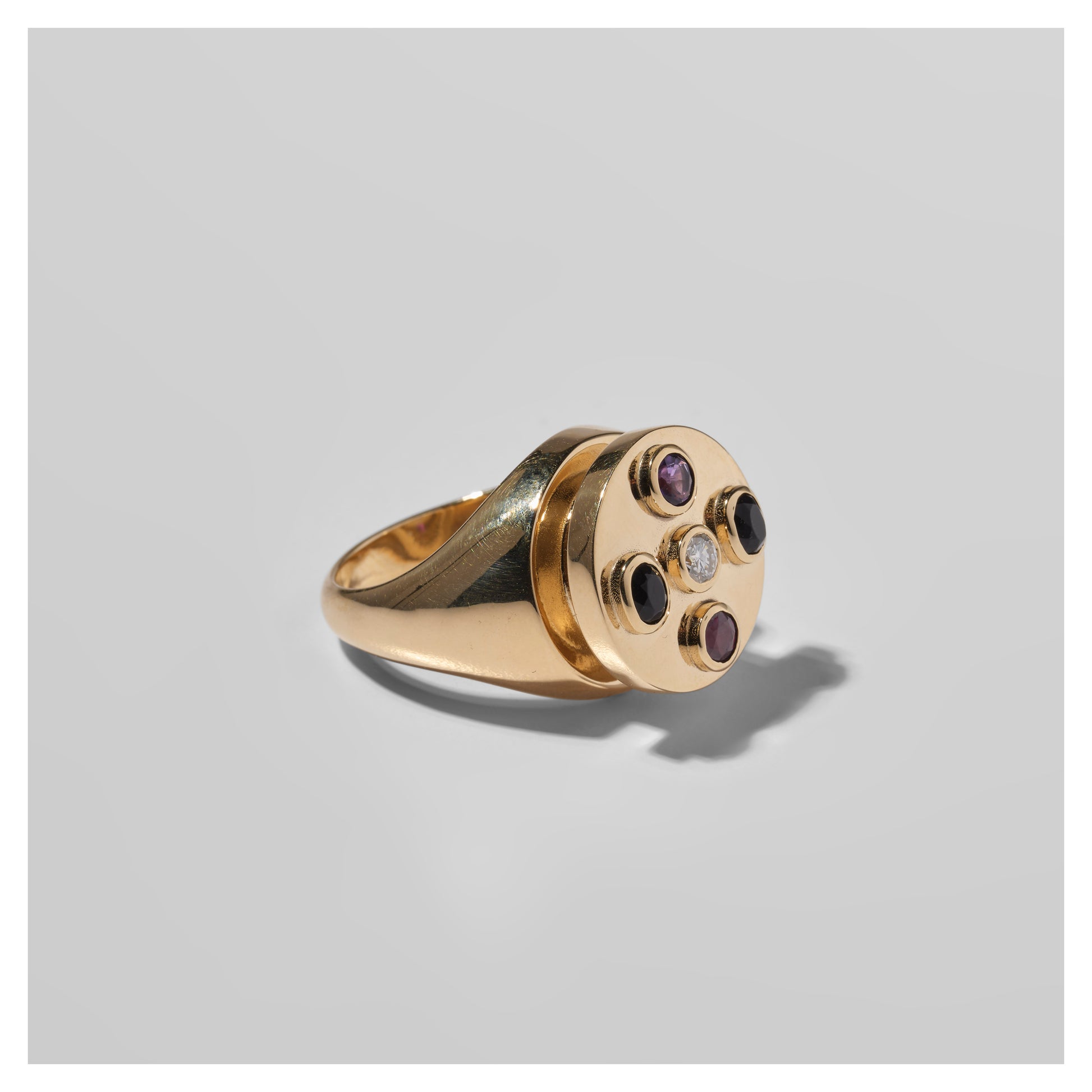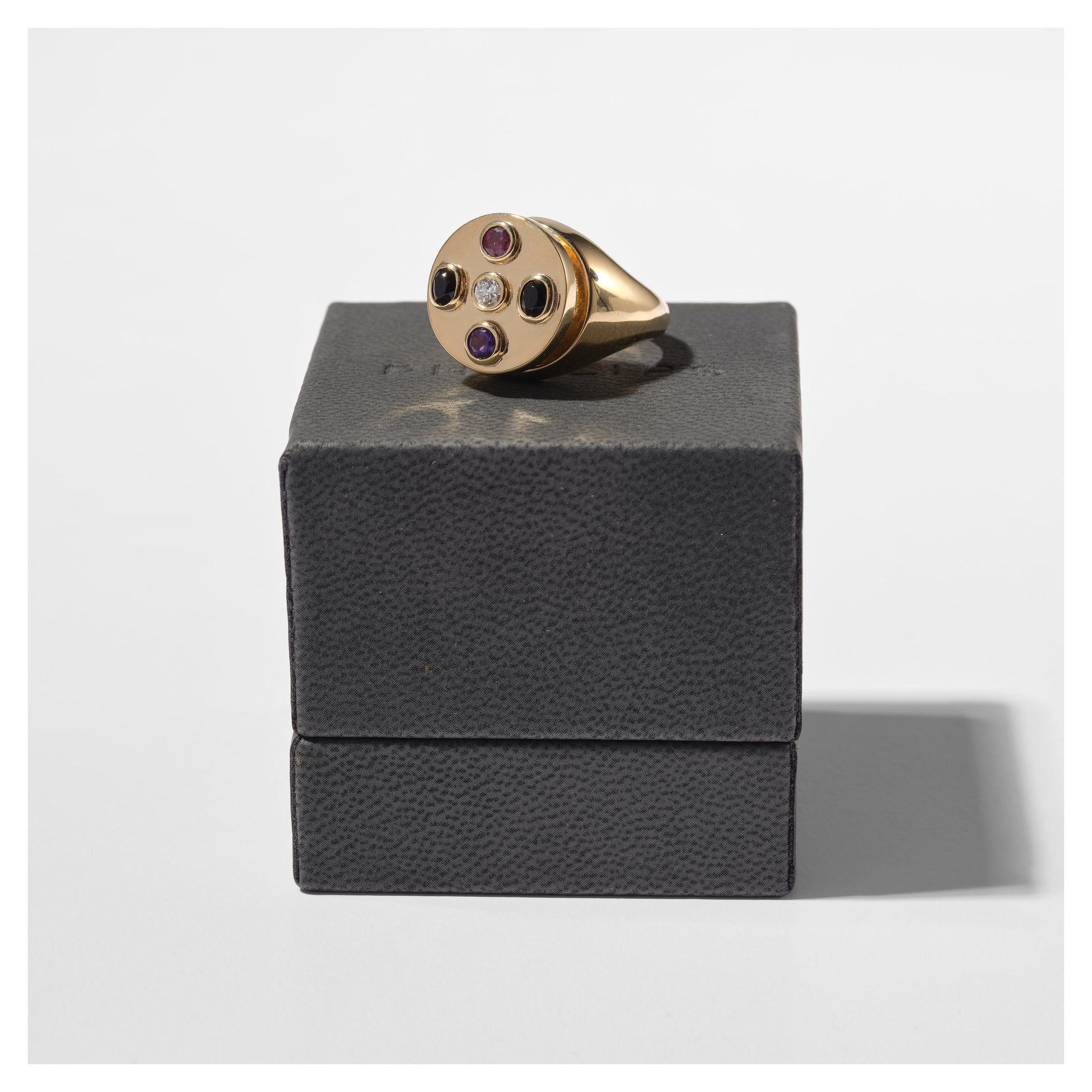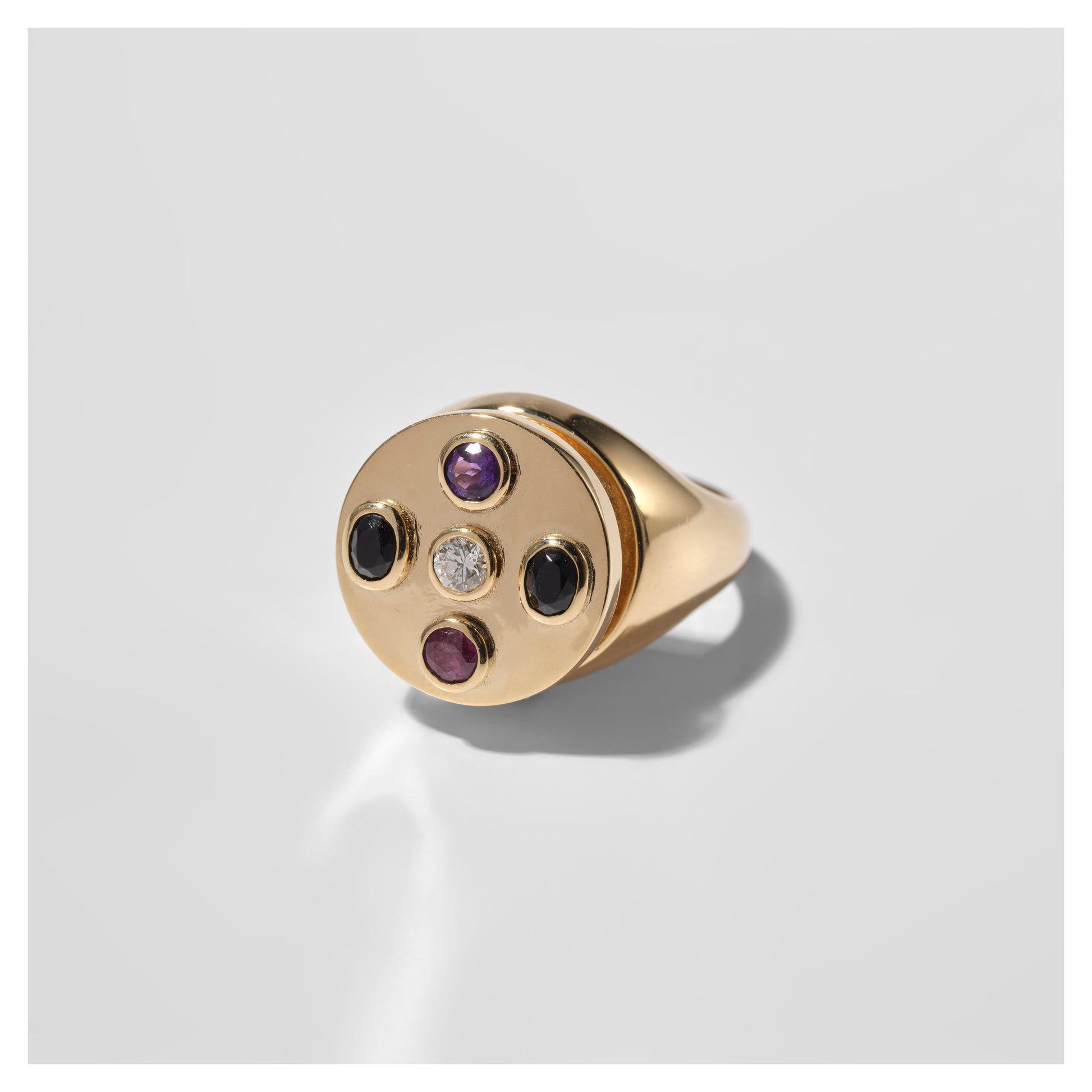 Medium: 14 karat gold ring set with a brilliant-cut diamond, circular-cut ruby, circular-cut amethyst, and two oval-cut onyx.