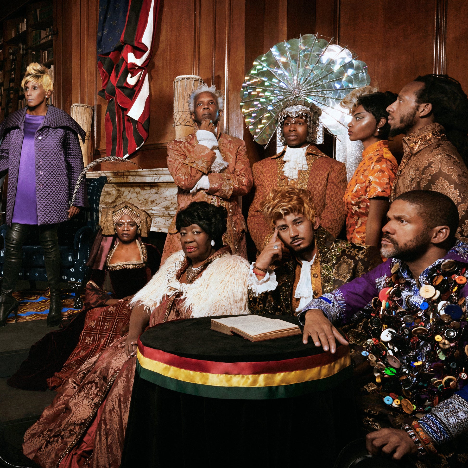 In this witty and dramatic large-scale work, the artist reinterprets Howard Chandler Christy’s iconic painting, Scene at The Signing of the Constitution of the United States, which is housed in the United State Capitol Building. In her contemporary (and glamorous) twist, Cox’s photograph reimagines modern-day women and men of color in the place of the Founding Fathers. Her subjects are all decked out ─ some in current fashions, others in 1700s period clothing, and some wear dazzling African garb.